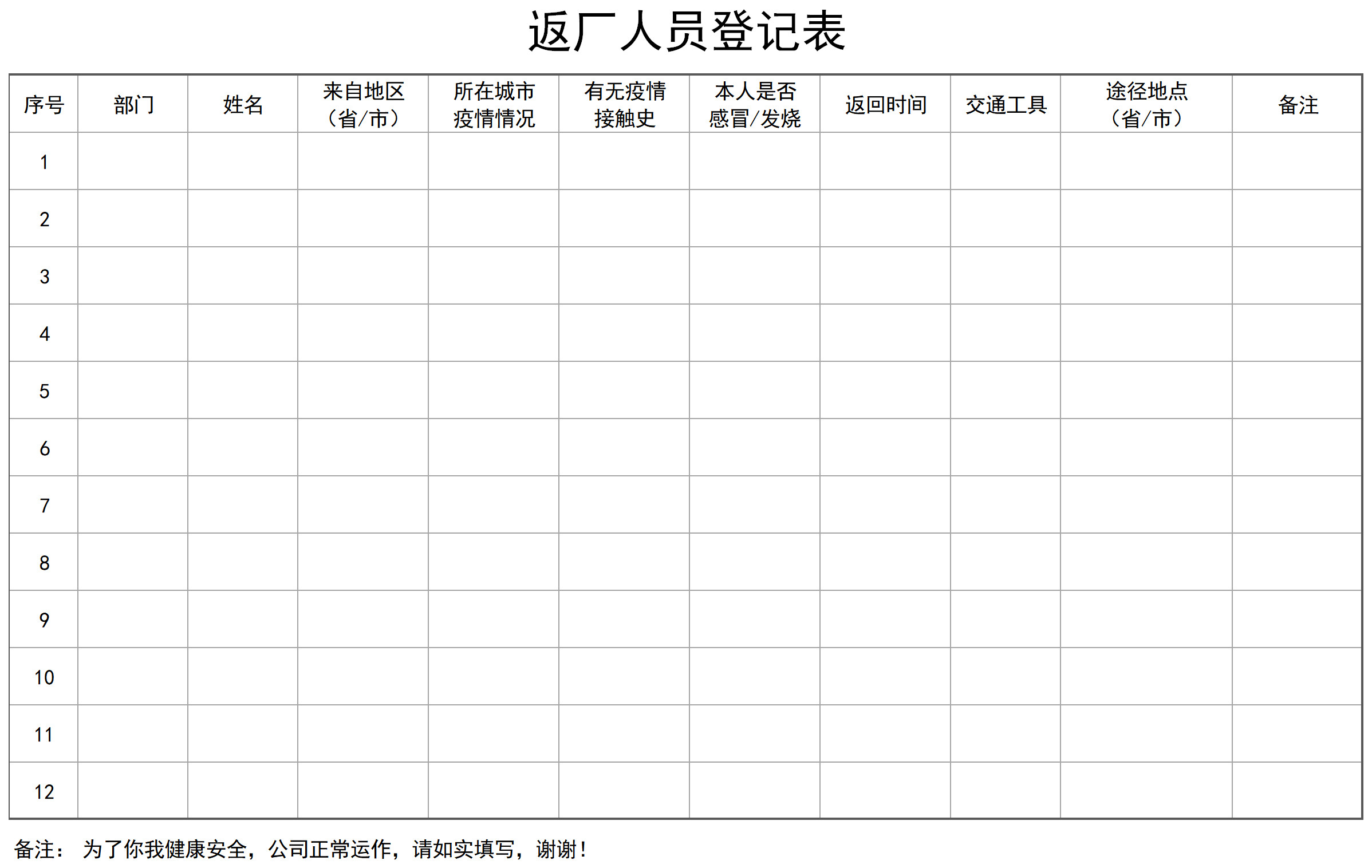 以上《返廠人員登記表》表格下載后支持自定義編輯,可視公司具體情況添補(bǔ)登記項(xiàng),于企事業(yè)單位范圍內(nèi)對肺炎疫情進(jìn)行科學(xué)的管理把控。