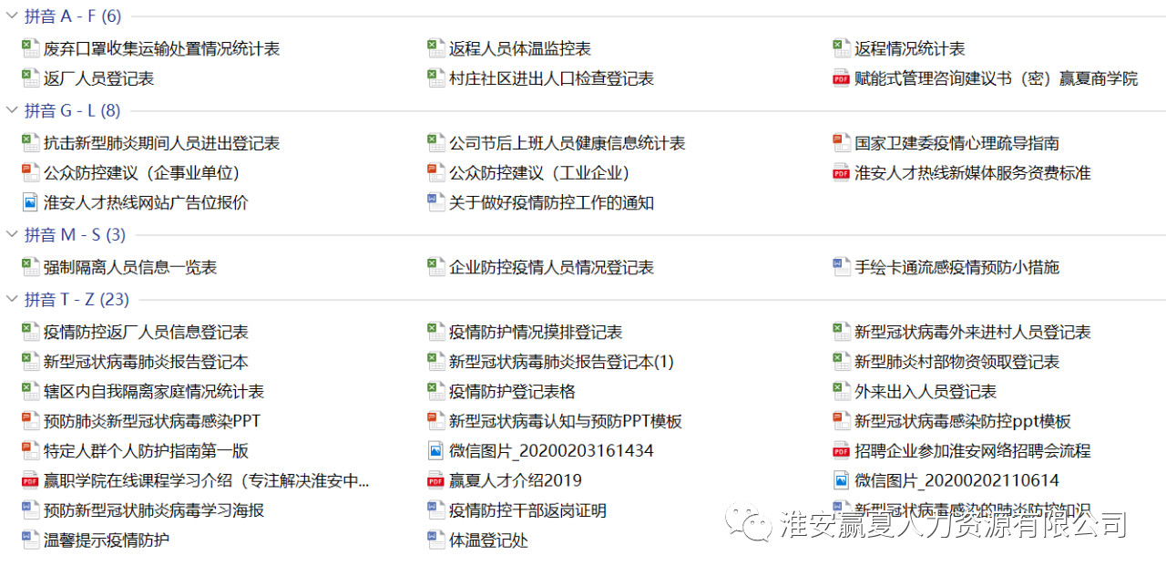 為盡綿薄之力,淮安贏夏人力資源有限公司為大家準(zhǔn)備了企事業(yè)單位新型肺炎防控管理文檔【全套模板】。助力春節(jié)返工期少一些忙亂和隱患,添一份有序和安全。