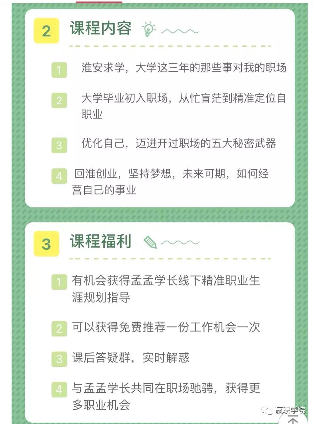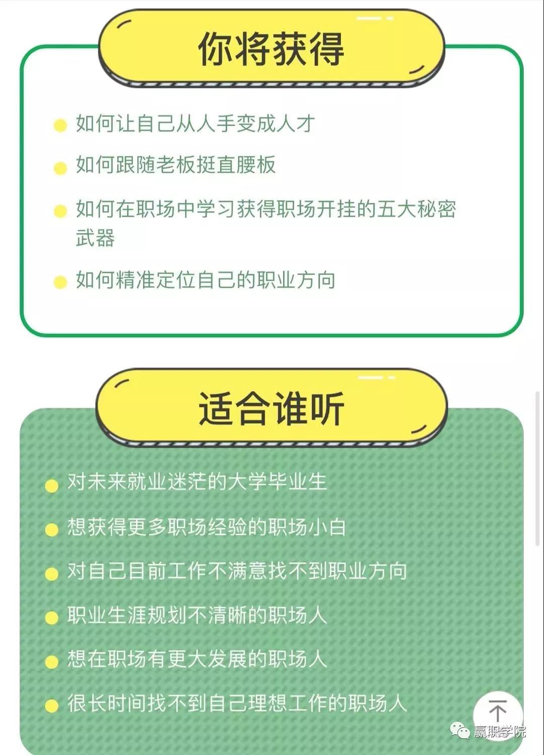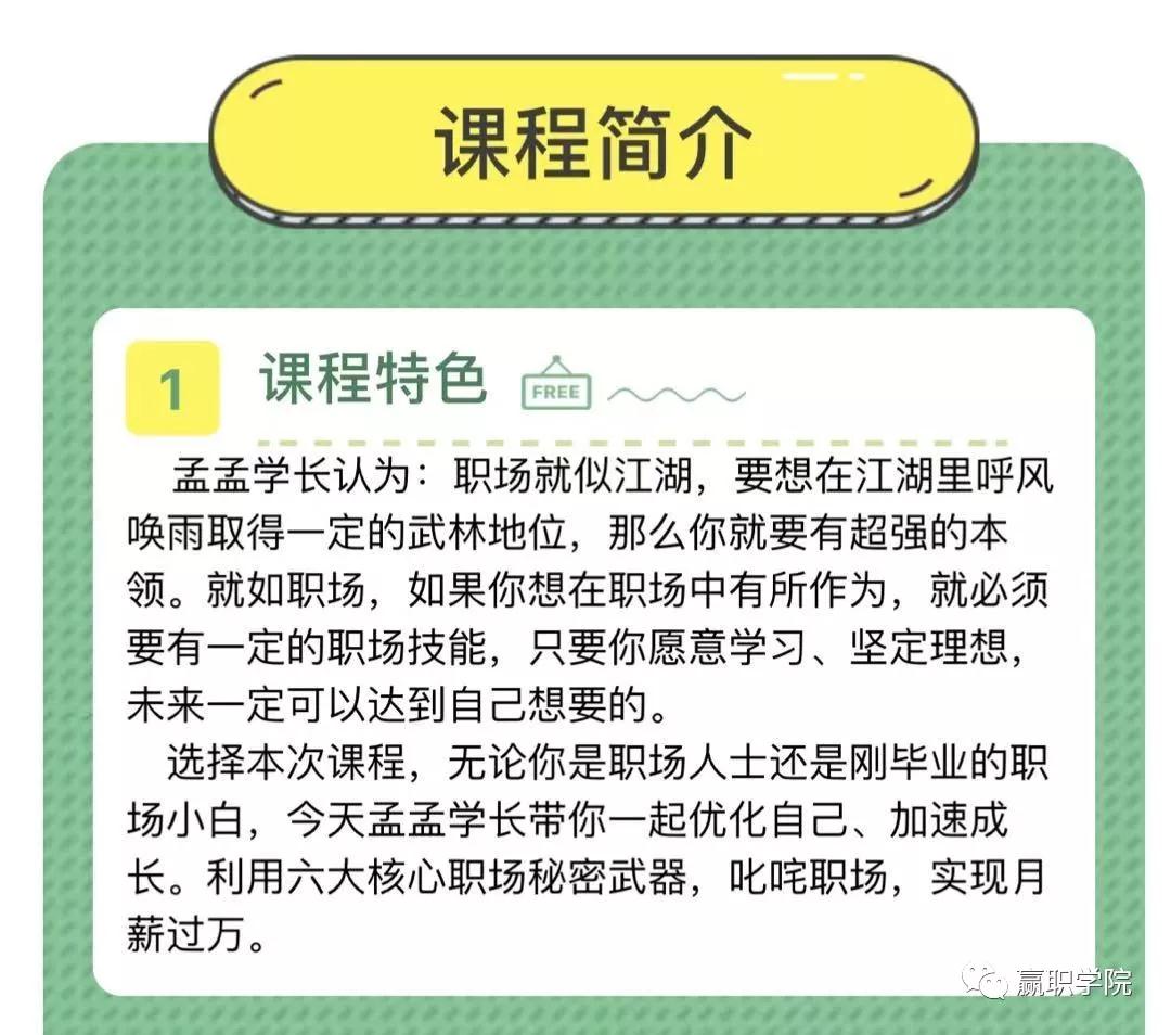 為了幫助大家解決這類問題,在此強烈推薦《職場修煉手冊》系列課!從職場到人生,不同角度解決你在職場的迷茫,幫你找對方向。本系列共4個課程,均由有12年工作經(jīng)驗的孟孟學(xué)長主講,用自身豐富的經(jīng)驗及各種智慧、職場秘籍等,幫您解決職場難題!