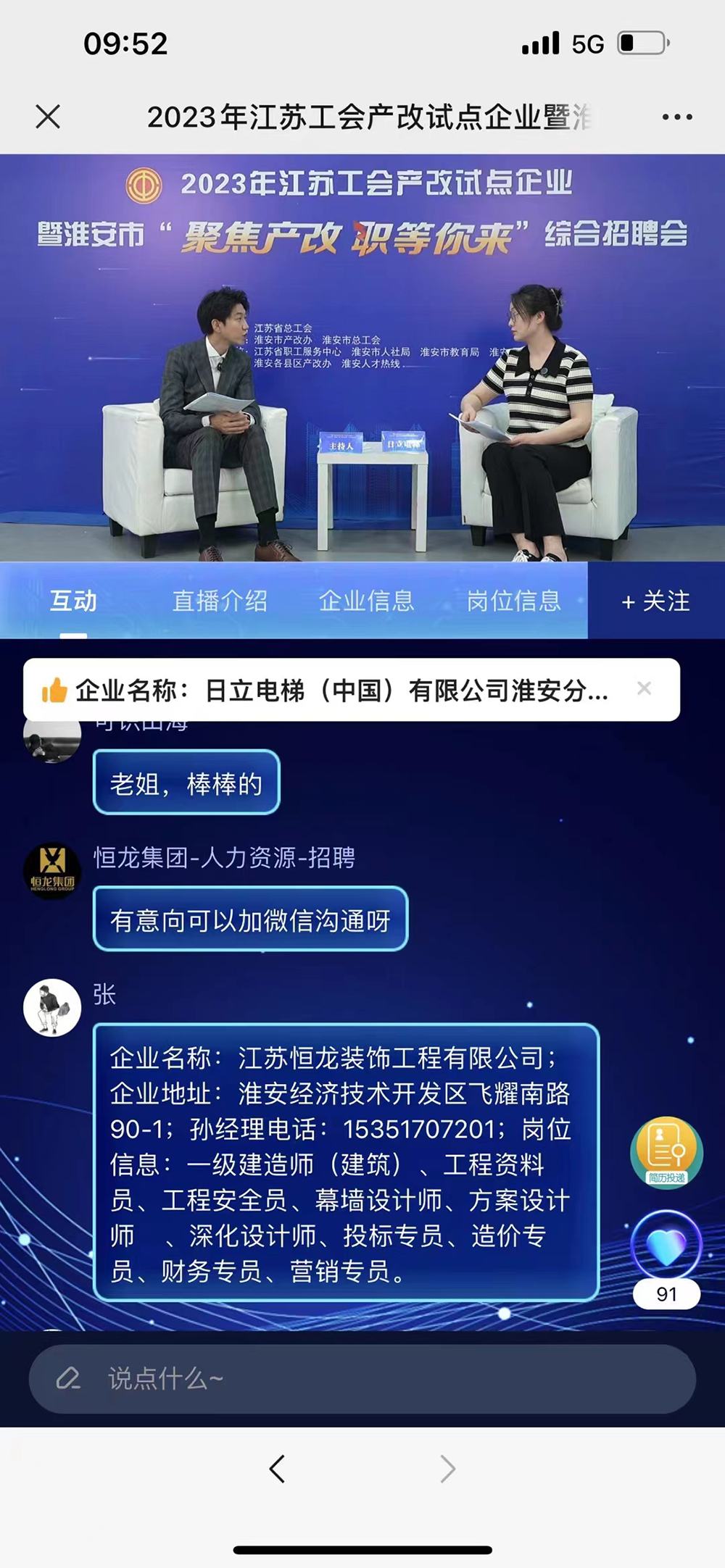 此次招聘會(huì)由省總工會(huì)主辦,淮安市產(chǎn)改辦、淮安市總工會(huì)承辦,采取線上直播招聘和線下現(xiàn)場(chǎng)招聘相結(jié)合的方式進(jìn)行,旨在為淮安市有用工需求的產(chǎn)改試點(diǎn)企業(yè),重大項(xiàng)目、重點(diǎn)工程、先進(jìn)制造業(yè)、專精特新企業(yè)、民營企業(yè)等用工企業(yè)搭建平臺(tái),并為轉(zhuǎn)崗待崗職工、農(nóng)民工、高校畢業(yè)生、困難職工家庭成員及其子女、新就業(yè)形態(tài)勞動(dòng)者及其家屬等提供就業(yè)崗位。招聘會(huì)吸引了西游集團(tuán)、中天鋼鐵集團(tuán)、金象傳動(dòng)設(shè)備股份、紐泰格科技集團(tuán)股份、理士電池、今世緣酒業(yè)、江蘇萬高服務(wù)外包有限公司等110余家用工單位參會(huì),共提供就業(yè)崗位近8000個(gè),涵蓋化工、機(jī)械、醫(yī)藥、酒店餐飲、能源、建筑地產(chǎn)、軟件開發(fā)等行業(yè),涉及工程師、銷售、會(huì)計(jì)、網(wǎng)絡(luò)運(yùn)營、技術(shù)員、質(zhì)檢員、施工員等崗位。9家企業(yè)還通過直播形式,向求職者介紹了企業(yè)概況、企業(yè)文化、招聘職位、福利待遇等。