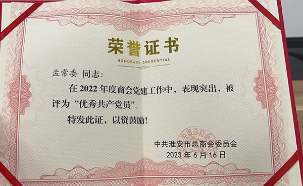 為紀念中國共產黨建黨102周年, 回顧黨的光輝歷程,謳歌黨的豐功偉績,進一步激發(fā)全市非公經濟企業(yè)黨員創(chuàng)業(yè)激情、創(chuàng)新智慧、創(chuàng)造活力、創(chuàng)優(yōu)動力。淮安市總商會黨委2022年度“兩優(yōu)一先”表彰大會在河南安陽舉行。贏夏人才集團董事長孟常委被評為“優(yōu)秀共產黨員”。并在現(xiàn)場舉行的二十大精神知識競賽中榮獲三等獎。